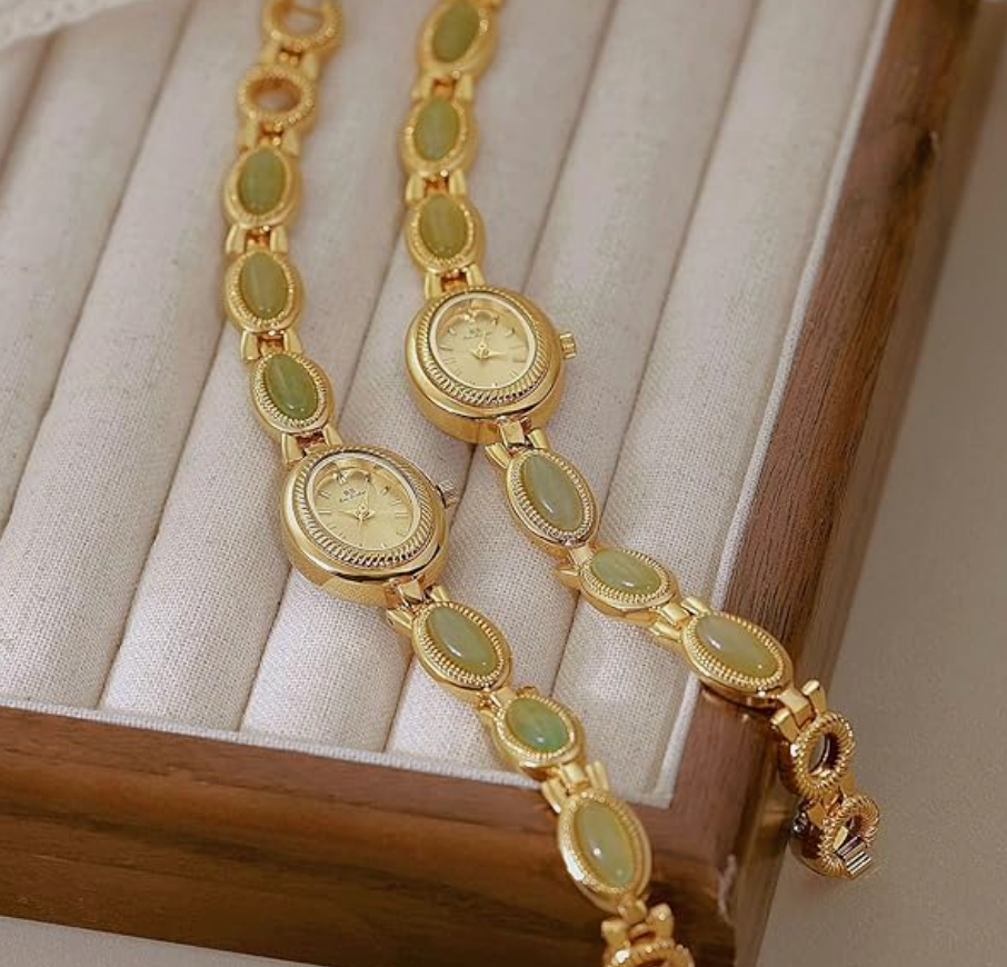 Discover the elegance of this luxury vintage-inspired gold watch designed for women. Featuring a delicate small oval dial adorned with colorful jade crystals, this dainty silver bracelet watch combines timeless style with modern quartz precision. Its waterproof design ensures durability, making it perfect for both everyday wear and special occasions. The bangle-style bracelet adds a refined touch, seamlessly blending jewelry and functionality for a sophisticated accessory that complements any dress.